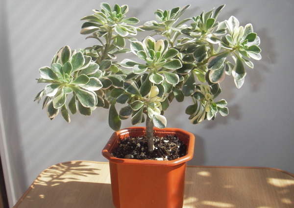 Листовые розетки формируются на концах ветвистых побегов. По краям листовых пластин располагаются полоски белёсого, кремового либо розового оттенков. Соцветия мелкие, жёлтые.